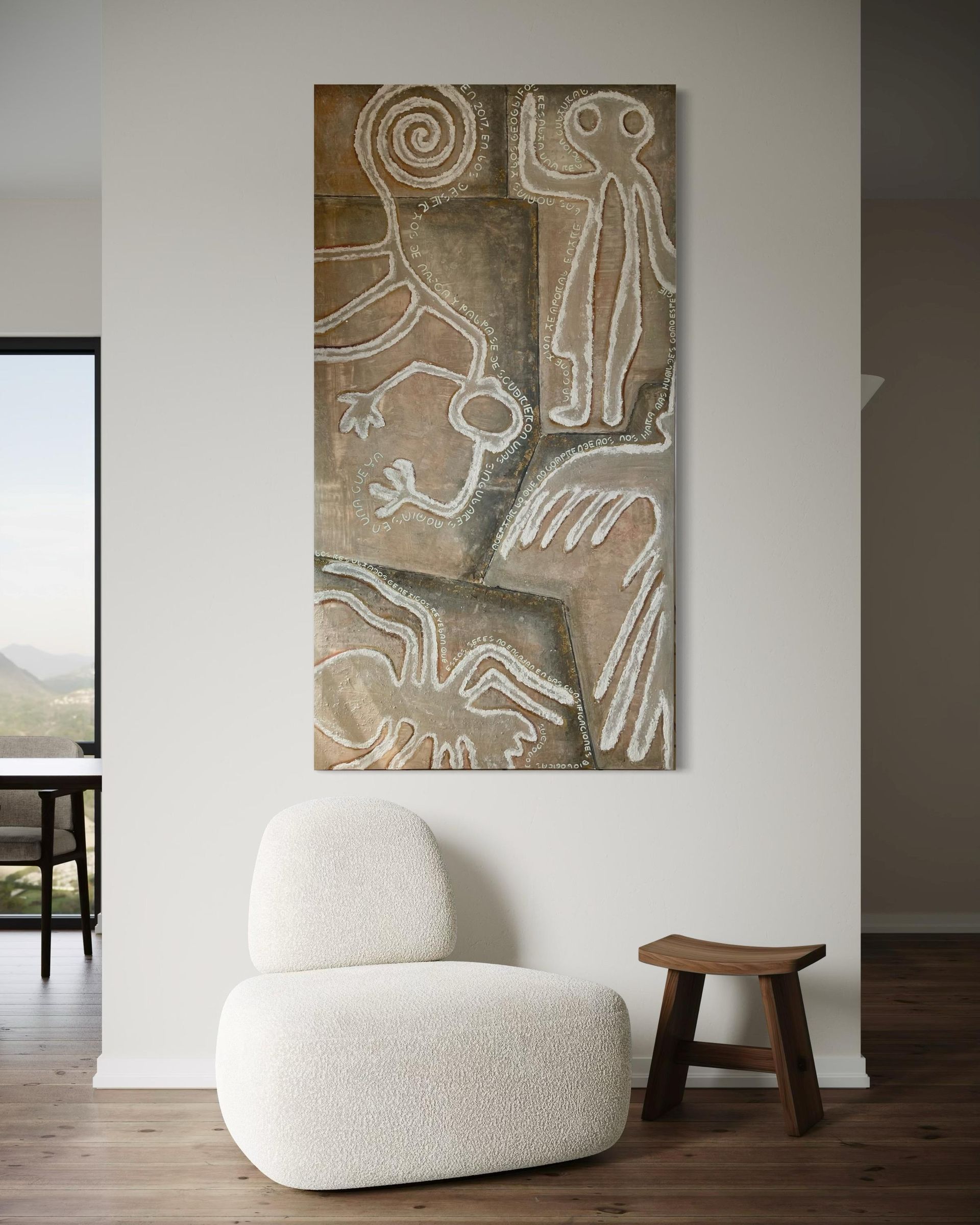 Con una paleta que evoca los tonos terrosos del desierto y utilizando texturas arenosas y pigmentos naturales, con detalles en Oro, reflejando el legado y el misterio de la cultura nazca. Inscripción misteriosa con tipografia exclusiva.